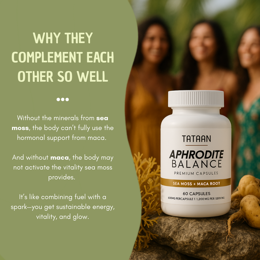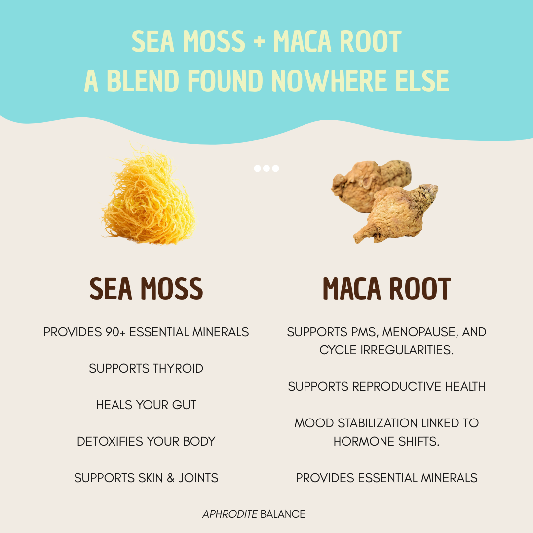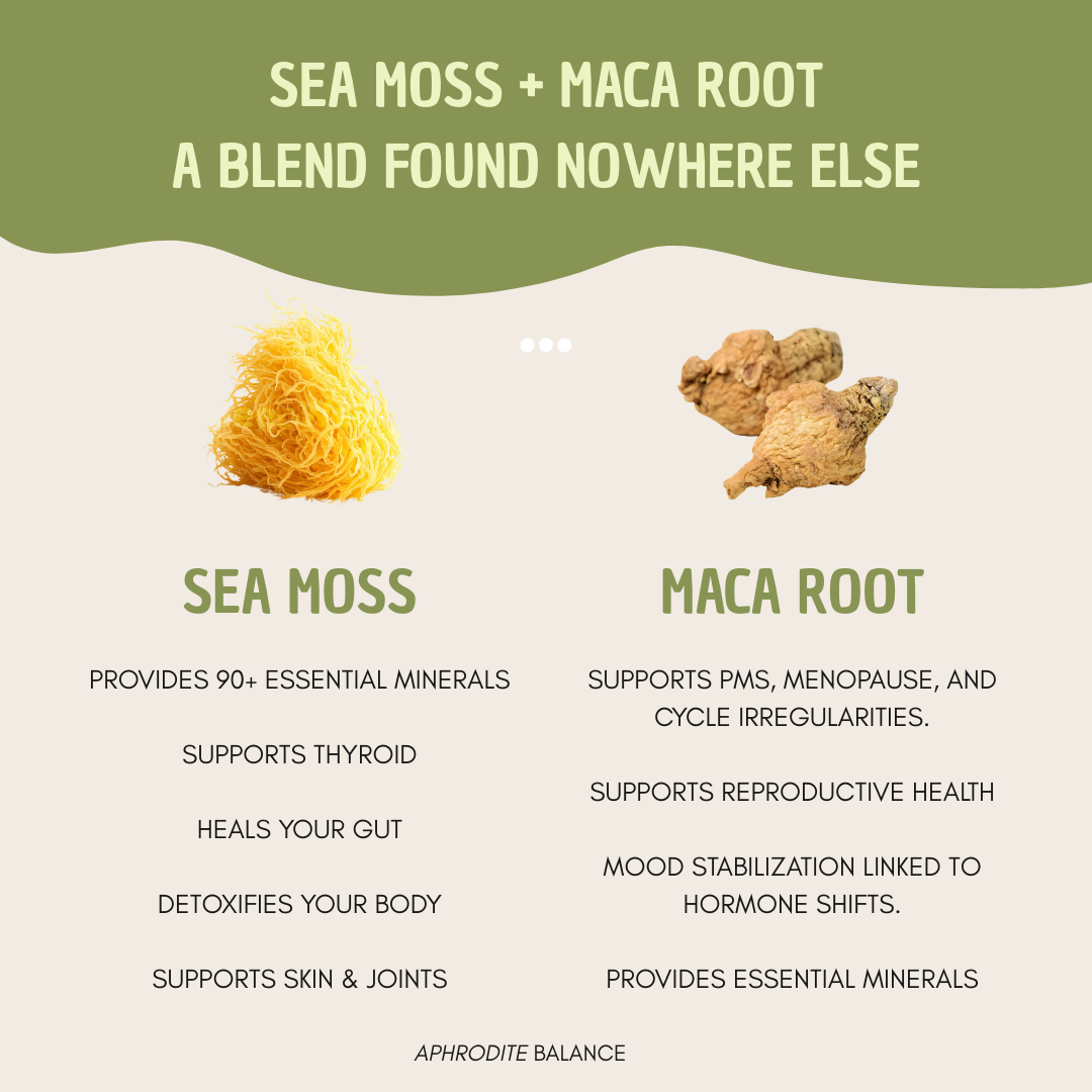 From the depths of the ocean and the heights of the Andes comes a union designed for the divine feminine. Sea Moss, overflowing with 90+ minerals, nourishes every cell, feeding your beauty, your glow, and your inner strength. Maca Root, the sacred energy of the earth, awakens your hormones, ignites vitality, and restores the balance your body has been craving.