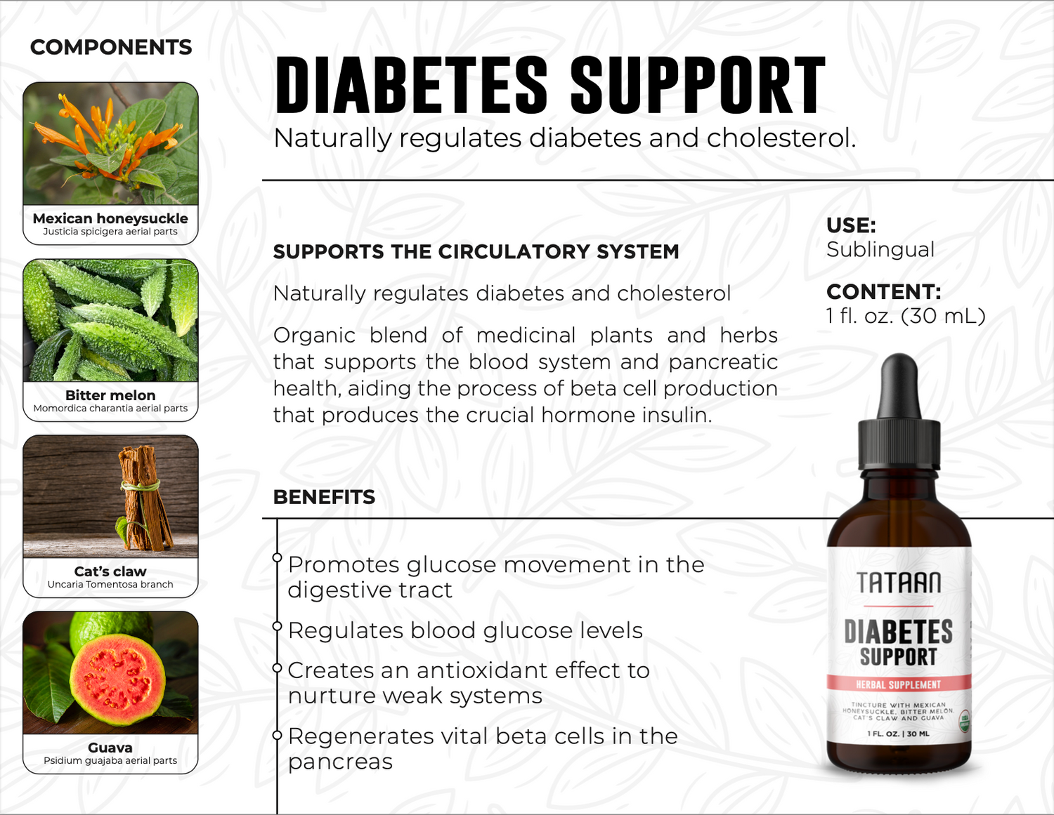 Diabetes Support Tincture is a formula designed as an adjuvant in the management of type 2 diabetes. It contains a combination of natural ingredients selected for their properties to regulate blood sugar levels and support circulatory health.